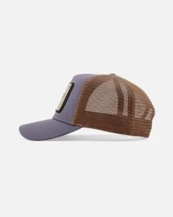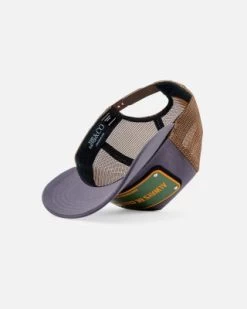 Featuring a miniature aluminum embossed plate printed in olive green with orange letters on a purple/grey visor with a brown mesh. This is a must-have style accessory for anyone making deals.