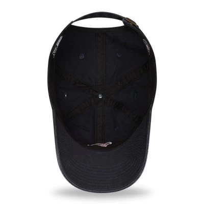 A vintage looking adjustable cap with a well-worn style. It is an unstructured cap with a pre curved visor and a metal buckle for adjusting at the back.
